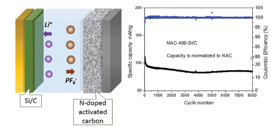 该论文以自主研发的氮掺杂超级活性炭作为混合电容器的正极材料,以自主研发的硅炭材料作为混合电容器负极材料,创新性地研发出高能量密度的锂离子超级电容器。该氮掺杂活性炭正极材料在高能量混合电容器中起着决定性作用,课题组利用农业废弃物的玉米芯作为前驱体,以氨气作为氮源,制得比表面积高达 2800 m2/g以上的氮掺杂活性炭。该新型混合超电容器在1747 W/kg功率密度下,能量密度高达230 Wh/kg(基于活性材料计算),而在141 Wh/kg能量密度(基于活性材料计算)下,其功率密度可高达30 kW/kg,其循环寿命达到8000次以上。该研究成果为研发下一代高性能储能技术提供了新的科学视角,可能具有巨大的商业化应用潜力。