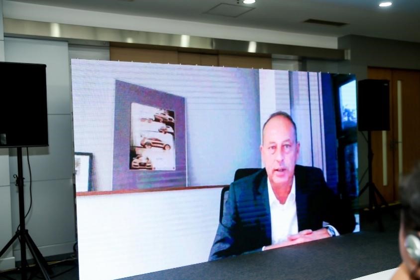 “开发未来汽车的全球挑战”主题的线上线下融合圆桌讨论。前排从左到右:圆桌讨论主持人、偷拍视频