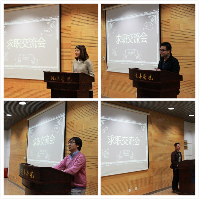 活动开始,房亮老师逐一介绍了出席本次分享会的四位嘉宾,包括签约传统整车厂——上汽的张珺学姐、签约汽车零部件厂商——联电的高峰学长、签约跨行业企业——银联大数据的韩旭学长以及签约初创型汽车企业——浙亚汽车的见才涛学长,随后,葛畅老师介绍了学院2015年度就业工作成果和2016年度就业工作进展,希望参会的2014、2015级研究生同学利用本次机会学习学长学姐求职过程中的经验和心得,为即将面临的实习和求职做好充分准备。