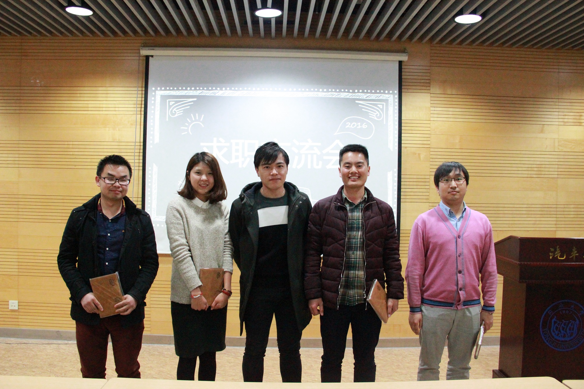 2014级四个硕士党支部联合举办了求职达人经验分享会。学工办葛畅老师、房亮老师和曹卢老师出席了本次活动,支部邀请到非常具有代表性的4位2013级已签约的学长学姐,吸引了研二、研一的许多同学。