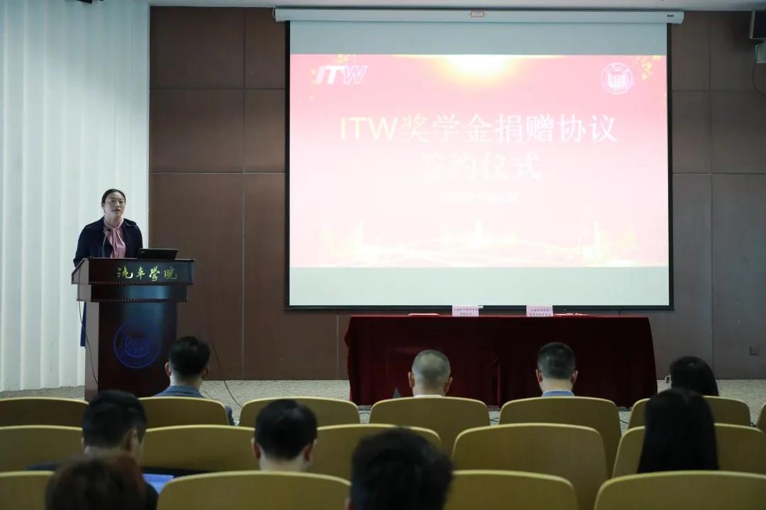 党委书记曹静致辞。她首先对ITW公司捐赠奖学金,助力学生发展表示感谢,并简要介绍了偷拍视频