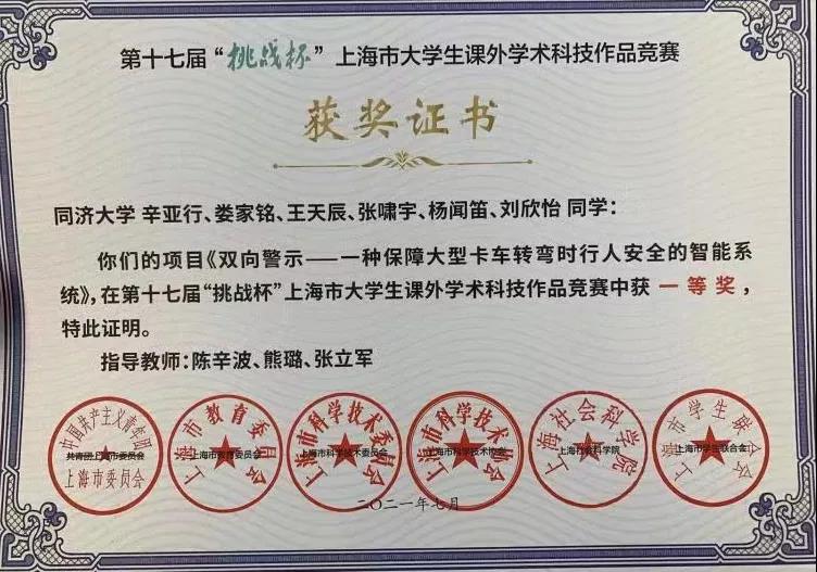 大学生创新项目《双向警示——一种保障大型卡车转弯时行人安全的智能系统》荣获第十七届“挑战杯”上海市大学生课外学术科技作品竞赛一等奖。