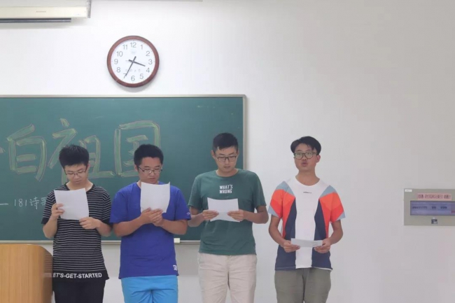 181团支部的同学们举行了“青春告白祖国”诗歌朗诵大赛,向祖国真诚诉说我们的心声,为亲爱的祖国母亲七十大寿献礼!