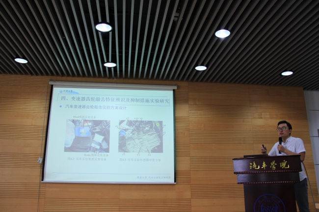 吴虎威的演讲主题是《机械变速器齿轮敲击的非线性动力学解析及其实验研究》,他向大家介绍了博士期间的研究成果,主要聚焦于六速手动变速器齿轮敲击振动的噪声问题,揭示了该噪声问题产生的机理,并提出了两种具体的抑制噪声的措施。赵老师认为该课题研究的系统全面,对吴虎威博士生的成果给予了高度重视,并就其实车实验中转速传感器的设置缘由及布置方式进行了细致交流。