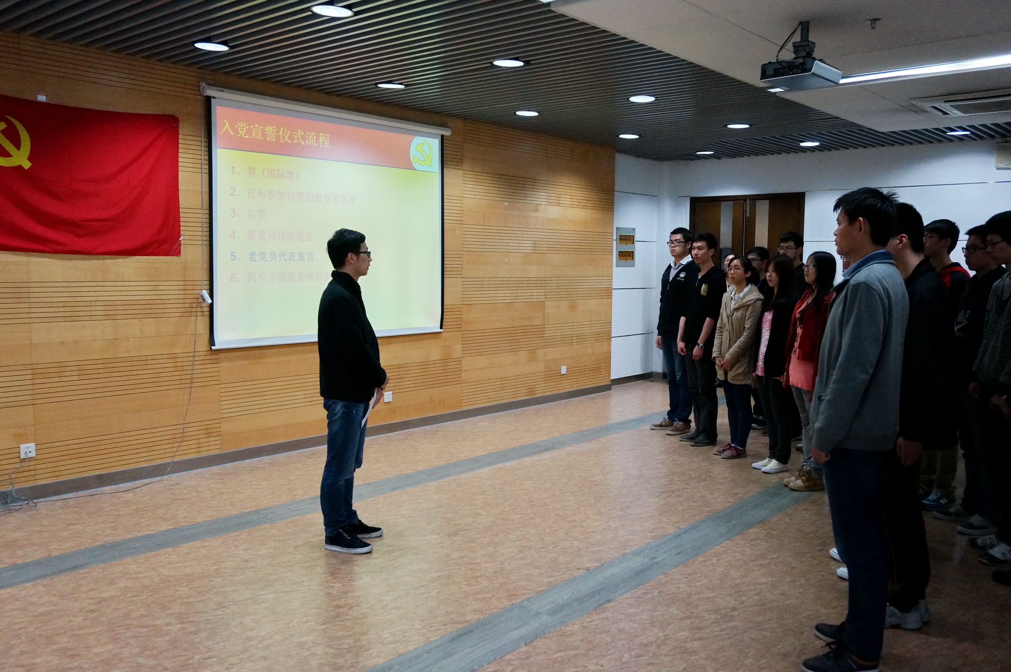 宣誓仪式首先奏国际歌。当现场响起了庄严的国际歌时,39名新党员庄严肃穆,认真感悟着国际歌的精神。国际歌之后,由葛畅老师带领,39名新党员面向鲜红的党旗,举起右手,郑重宣誓,立下对党忠诚的誓言:对党忠诚,积极工作,为共产主义奋斗终身,随时准备为党和人民牺牲一切,永不叛党。