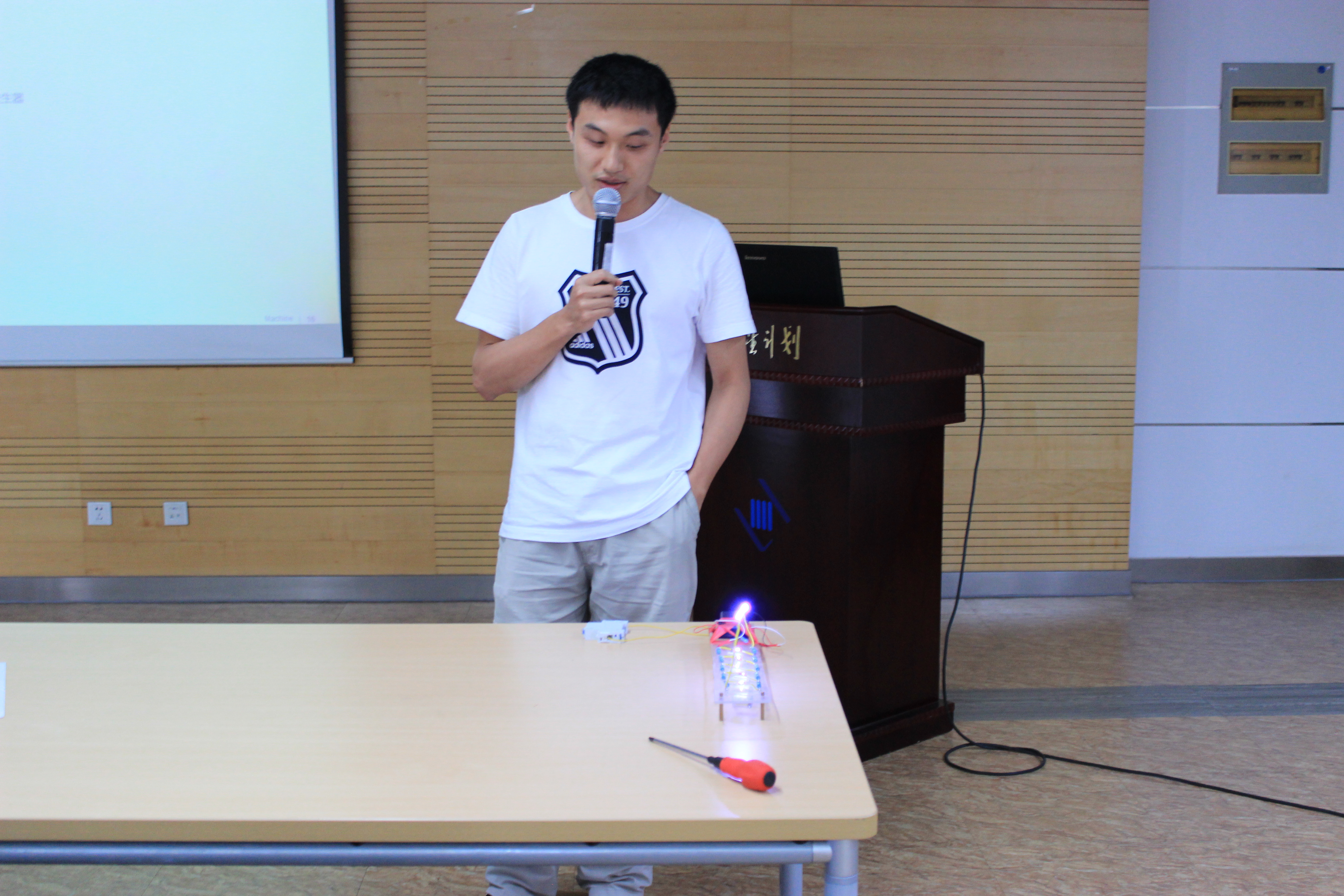 论坛中,陆海峰博士和方剑光博士分别对各自的题目做了细致入微深入浅出的讲解。方剑光博士讲解了车身结构采用代理模型方法进行优化的流程与重难点,包括其中的不确定性和最优解的选取等研究点。陆海峰博士向大家展示了前沿的发动机高能点火技术及其与传统方法的区别。并在现场演示了高压点火的试验,给大家留下了深刻印象。在报告人讲解完毕后,现场博士生对研究内容进行了提问,互动交流,现场氛围活跃。然后两位点评导师对报告人的报告给予了肯定和中肯的建议。会后还有博士们单独找主讲人进行深入的交流。讲座结束后,由周鋐教授和赵治国教授向两位报告人发了荣誉证书并和全体听众一起合影留念。