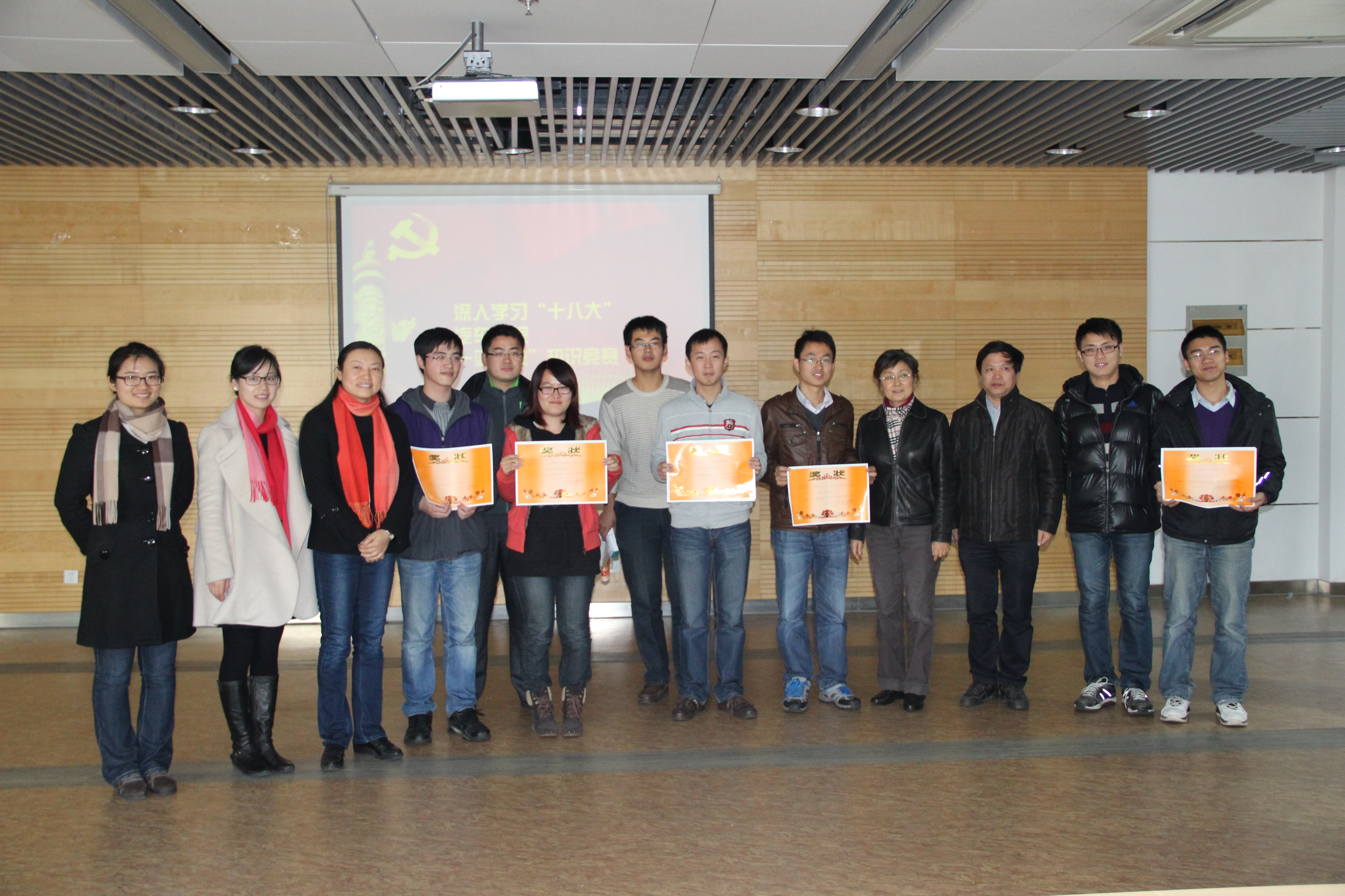 赛后,曹静老师作了总结发言,她指出本次竞赛涉及面广,寓教于乐,是一项创新的党员集体学习形式,竞赛过程也是跌宕起伏,引人入胜。曹老师希望广大学生党员继续深入学习宣传贯彻十八大精神,理论联系实际,在各项活动中创先争优,起到党员的模范带头作用。最后,老师们为获奖的支部和同学颁奖并合影留念,本次知识竞赛圆满落幕。