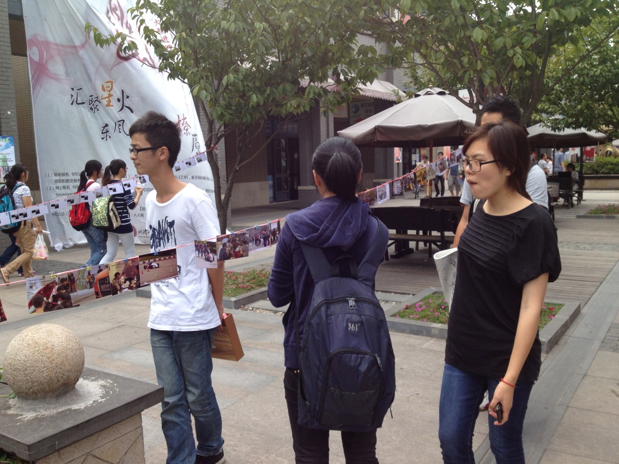 展出现场的气氛非常活跃,风采各异的明信片,引来的众多同学的围观。参与过这些活动的同学们都兴奋地寻找的着自己的影子。由于明信片展出的位置正好在食堂与宿舍楼之间,大部分同学在用完午餐后,都会在我们的明信片展区驻足停留,寻找当时的自己,寻找当时的同伴,寻找当时的故事,寻找当时的激情与感动。盛大的12·9歌会,温馨的公益活动,极具活力的大型校园企划日,充满着速度与激情、智慧与斗志的车队赛事……这所有的一切,都让人心潮澎湃、心驰神往。在场的工作人员,在维持秩序的同时,还细心地为观看明信片的同学们讲解明信片的内容。