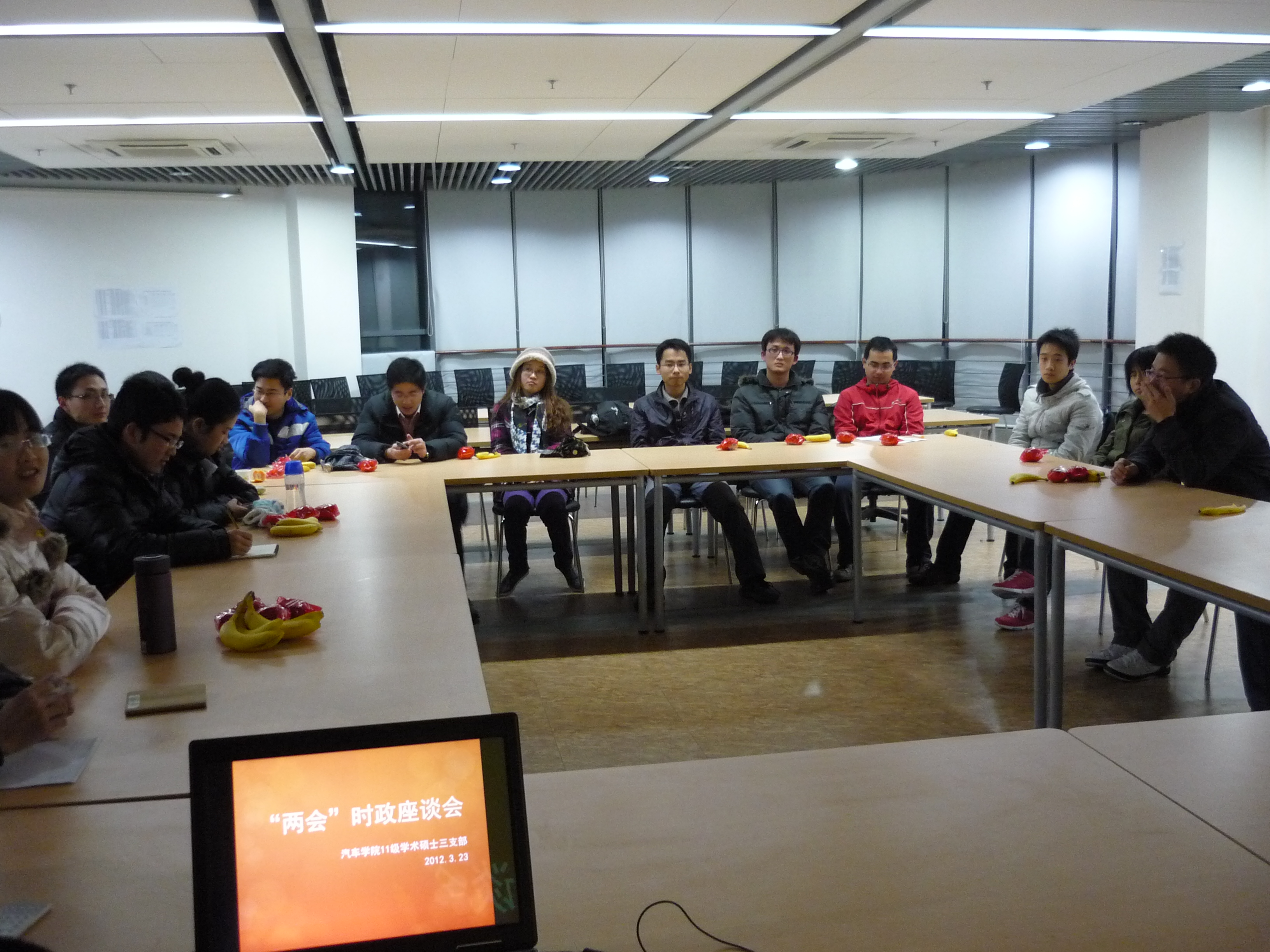 时政座谈会是11级学术硕士三支部的特色活动,旨在让党员同学关注当前时事政治,并就热点问题发表看法,研究时事政治与学科、行业、同学、群众之间的关系。作为本系列第一次活动,本次座谈会由支委会牵头,开展了议题为“汽车相关两会提案”的座谈会,主要关注了汽车业的兼并重组,自主品牌,公车采购,以及汽车三包、车内污染等与汽车行业息息相关的两会议题。