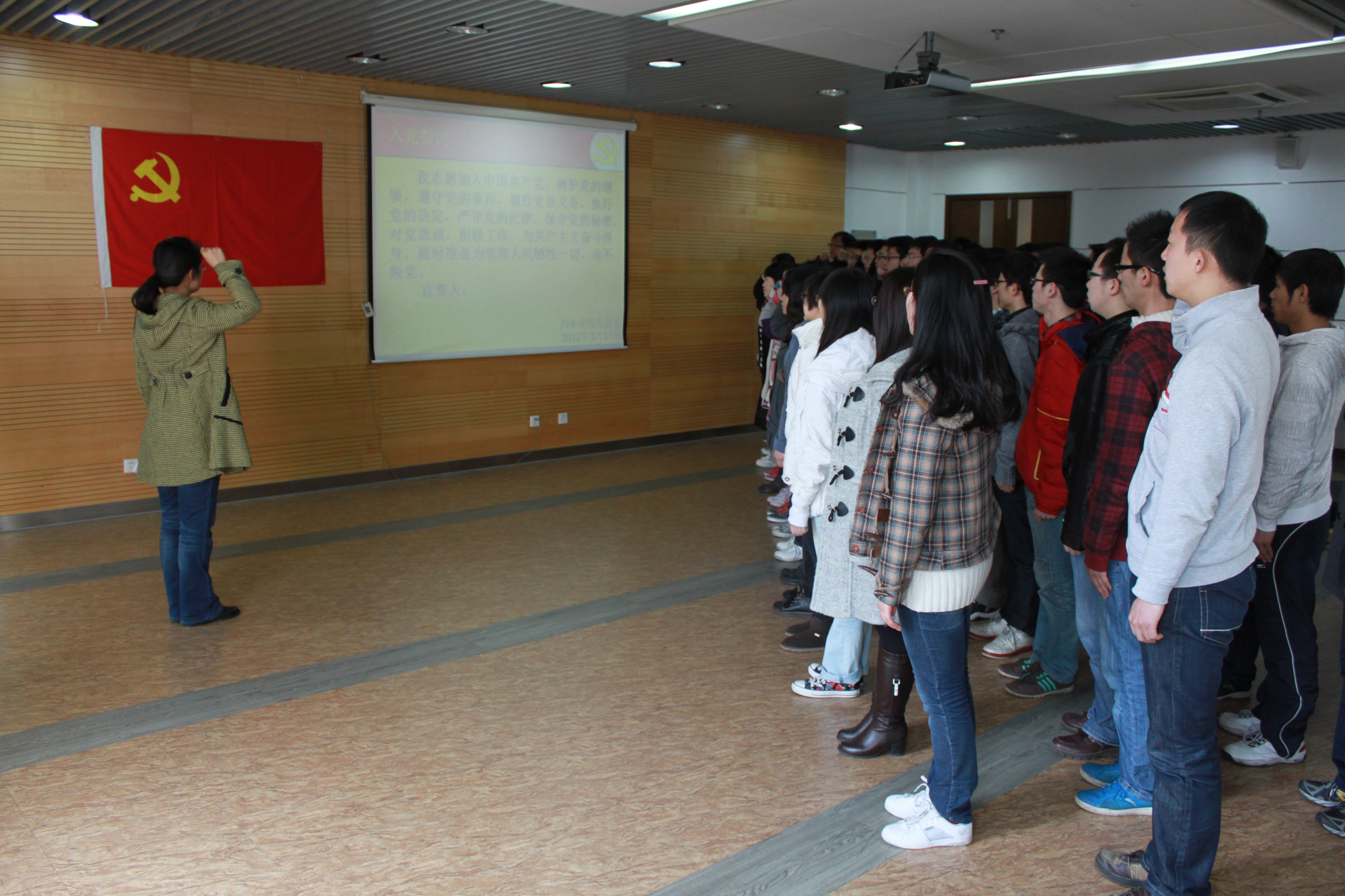 仪式现场响起了庄严的国际歌,47名新党员由葛老师带领,面向鲜红的党旗,举起右手,郑重宣誓,立下对党忠诚的誓言。