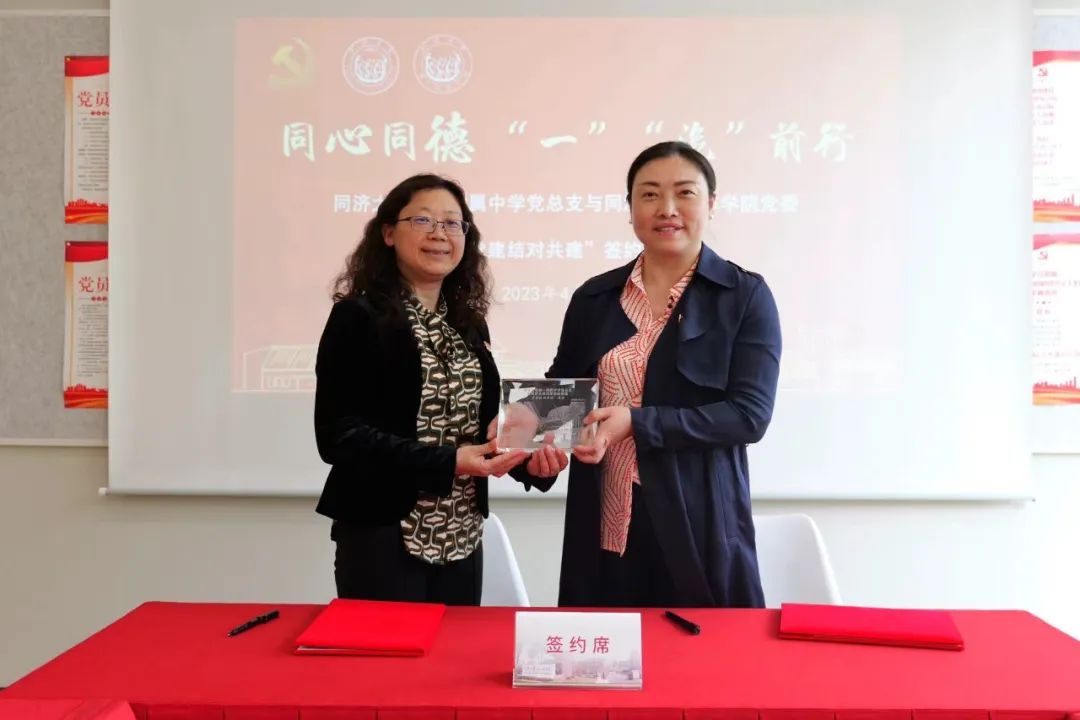 党委书记曹静与同济一附中党总支书记刘育蓓共同签署共建协议并合影留念。