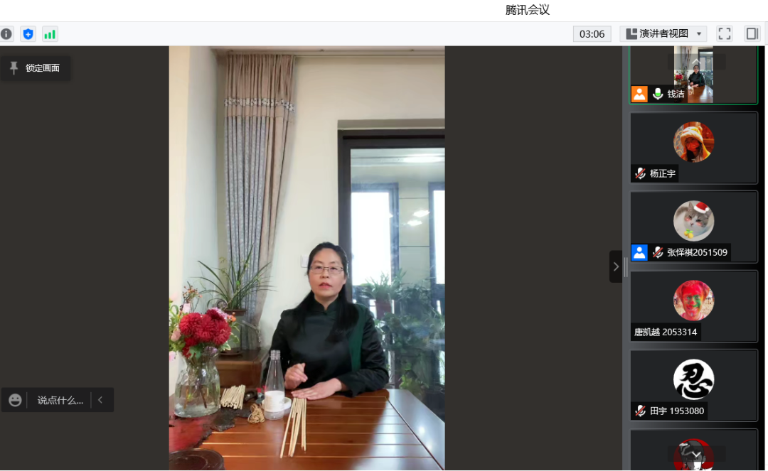 选修课程《中国传统插花艺术》主讲教师钱洁为同学们带来主题为“宿舍居家手工艺制作”的分享。钱洁老师着眼于宿舍居家生活中可以获得的插花器材,传授了竹签DIY花瓶插花和马克杯插花两种插花技巧。