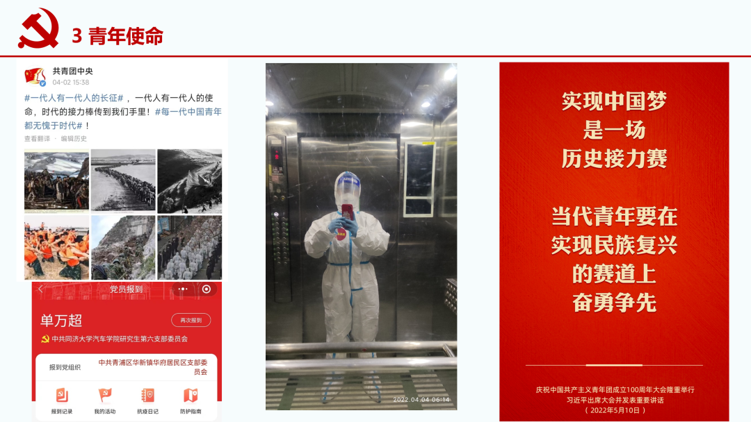 习近平总书记还指出,“入队、入团、入党,是青年追求政治进步的‘人生三部曲’”。这不禁让我回想起来当初的入队、入团、入党之路,通过组织的培养和自己的努力,终于完成了“人生三部曲”,但这也意味着有更大的责任。在未来的工作中,我也一定会继续践行共产党员的初心使命,争当伟大理想的追梦人,争做伟大事业的生力军!