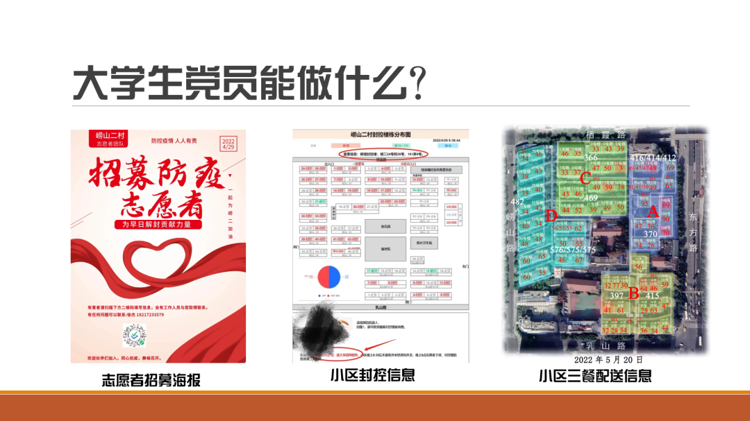 从4月12号上岗至今,每天工作超过6个小时,主要负责核酸检测、维护秩序、分发物品、门岗消杀、物资配送等工作。徐宏杰同学认为,作为一名毕业生党员,我们有更多时间、也有更多的技能为社区服务,也可以运用更多的工具帮助我们为社区更好的服务,因此我们也有更多的责任。徐宏杰同学利用自己的特长,帮助志愿者团队管理设计海报,也对志愿者的招募、排班,以及小区信息进行可视化处理。