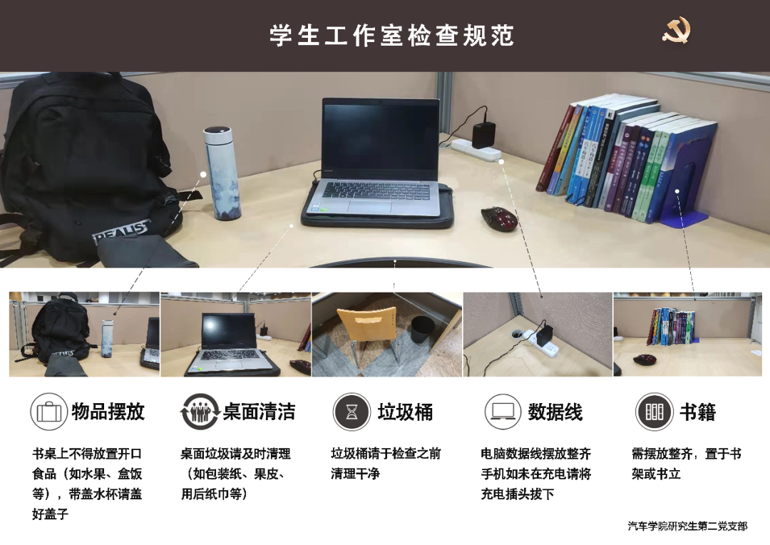 检查队伍构成:学院办公室教师代表、学院学生工作办公室教师代表、研究生第二党支部支委;学生工作室各派党员代表、非党员代表各一名随同检查。