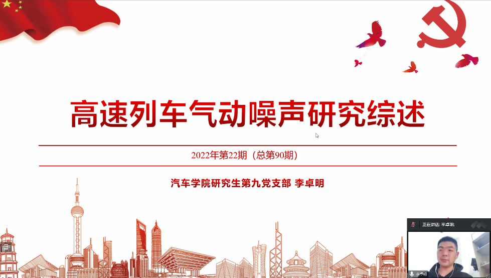 随后,由研究生第九党支部李卓明同志带来主题为“高速列车气动噪声研究综述”的专业知识分享。分享了高速列车气动噪声的研究背景,各个主要声源的特性和噪声控制方法,讨论了目前针对气动噪声的预测、分析和控制方法。以项目实例介绍了风洞中心在这一方面的具体工作。张智明老师肯定了学术分享在党建工作中的意义,并邀请高云凯、吴宪、左曙光、孟德建老师进行了点评。