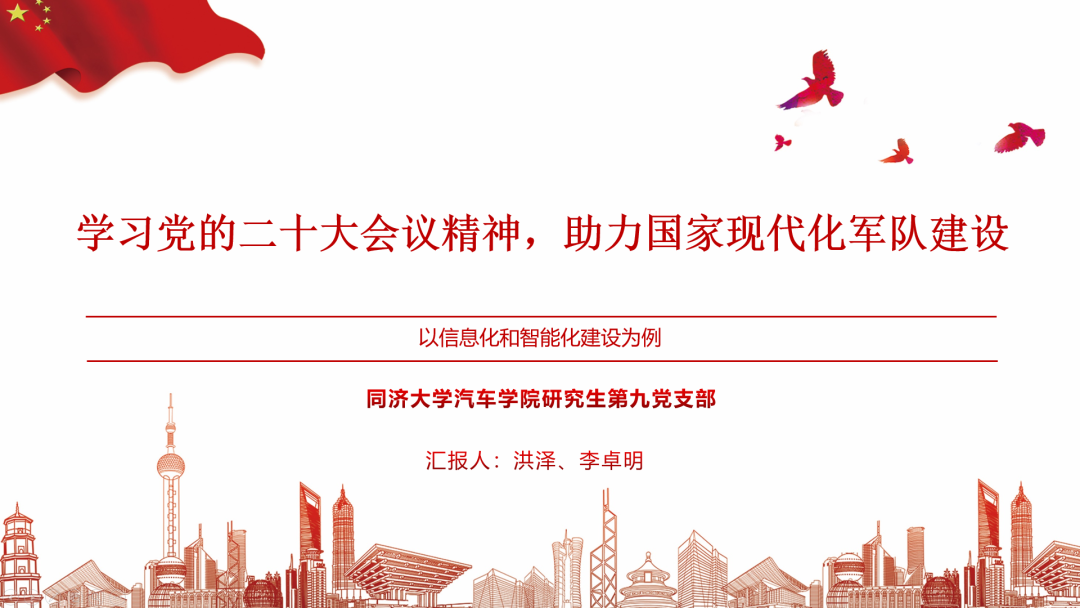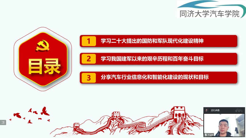首先,由研究生第九党支部洪泽和李卓明同志带来主题为“学习党的二十大会议精神,助力国家现代化军队建设”的理论知识分享。本次分析重点学习了党的二十大报告中对国防和军队现代化建设的论述,回顾我国国防和军队建设的伟大成就。同时强调了经济发展与科技进步对国防和军队现代化建设的重大作用,鼓励广大汽车青年要积极参与到国防科技进步的事业中,为保障人民的生命财产安全贡献自己的力量。分享结束后,张智明老师补充了偷拍视频