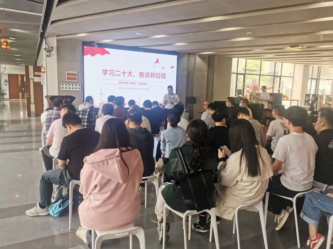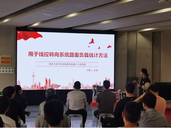 随后,研究生第十八党支部孟强同志带来题目为“用于线控转向系统路面负载估计方法”的专业分享。他详细介绍了线控转向技术的定义、优点与挑战。他提到运用线控转向系统转向负载动力学重构法的状态方程作为卡尔曼滤波器的预测方程,线控转向系统转向负载观测法得到的估计负载作为测量值,以此来实现路面负载估计。该方法在双移线试验中,最大均方差为2.842Nm,相比观测法降低了26.13%,相比观测法降低了32.94%,即平坦路面下综合法较好;在土坡实验中,综合法最大均方差为5.4359Nm,相比重构法降低了78.24%,相比观测法降低了39.11%,即不平路面下综合法较好。