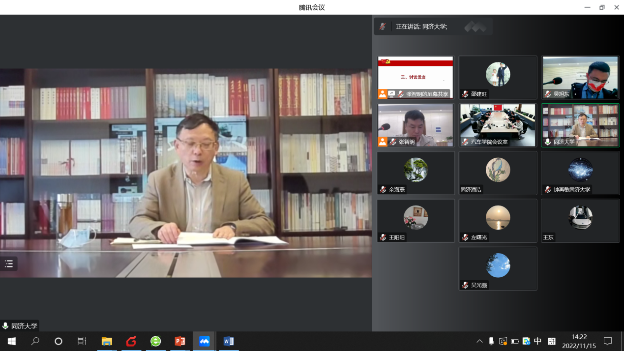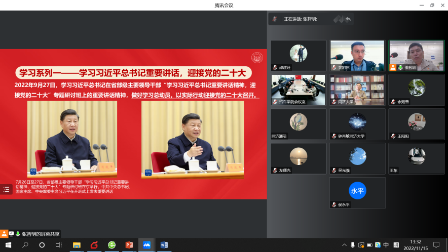 张智明首先介绍支部学习贯彻党的二十大精神情况,支部通过召开二十大精神学习动员会、集中学习二十大报告、开展“同车行”政治理论学习、党委委员讲党课等形式进行了一系列专题学习,并积极参加了学院党委组织的党支部书记集中学习、党委特邀报告等,深入学习领会党的二十大精神。