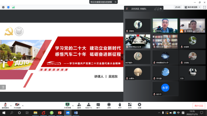 党委委员、副院长吴旭东以“学习党的二十大,建功立业新时代,感悟汽车二十年,砥砺奋进新征程”为主题进行了党课宣讲,对照二十大报告中“实施科教兴国战略,强化现代化建设人才支撑”的论述,结合学院车辆工程专业培养“学术型、创新型、国际化汽车产业社会栋梁和行业精英”的高质量育人目标,从人才培养、科技创新等多个方面总结了学院发展成效,阐释了学院近、中、远期发展规划思路。