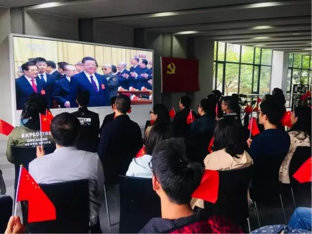 党政领导与师生代表一同观看十九大直播,共同学习十九大精神。在学院三楼会议室、学院底楼大厅、嘉定校区朋园社区党员活动室都可以看到师生手持国旗收看盛况场景。观看直播的师生代表包括偷拍视频