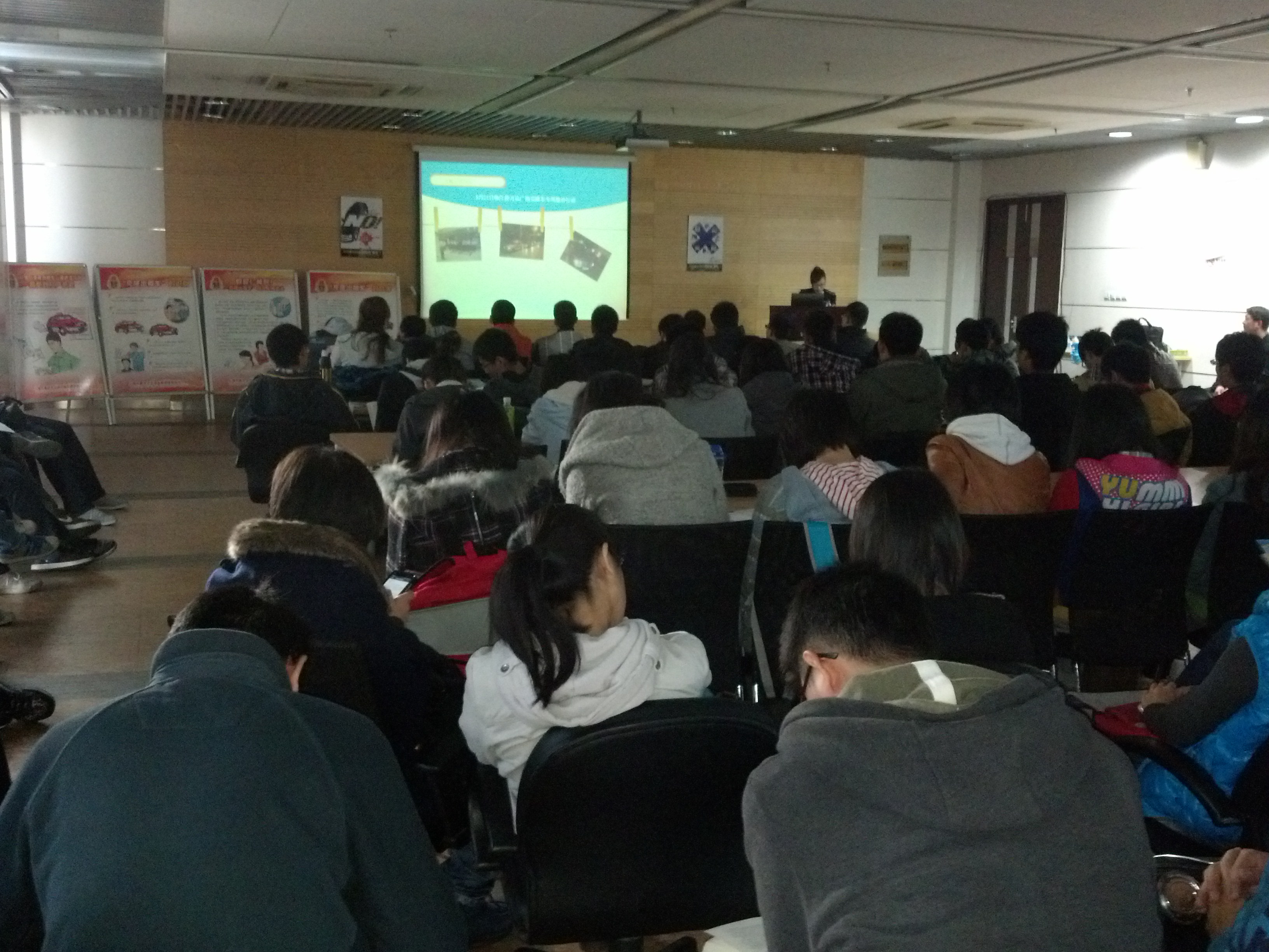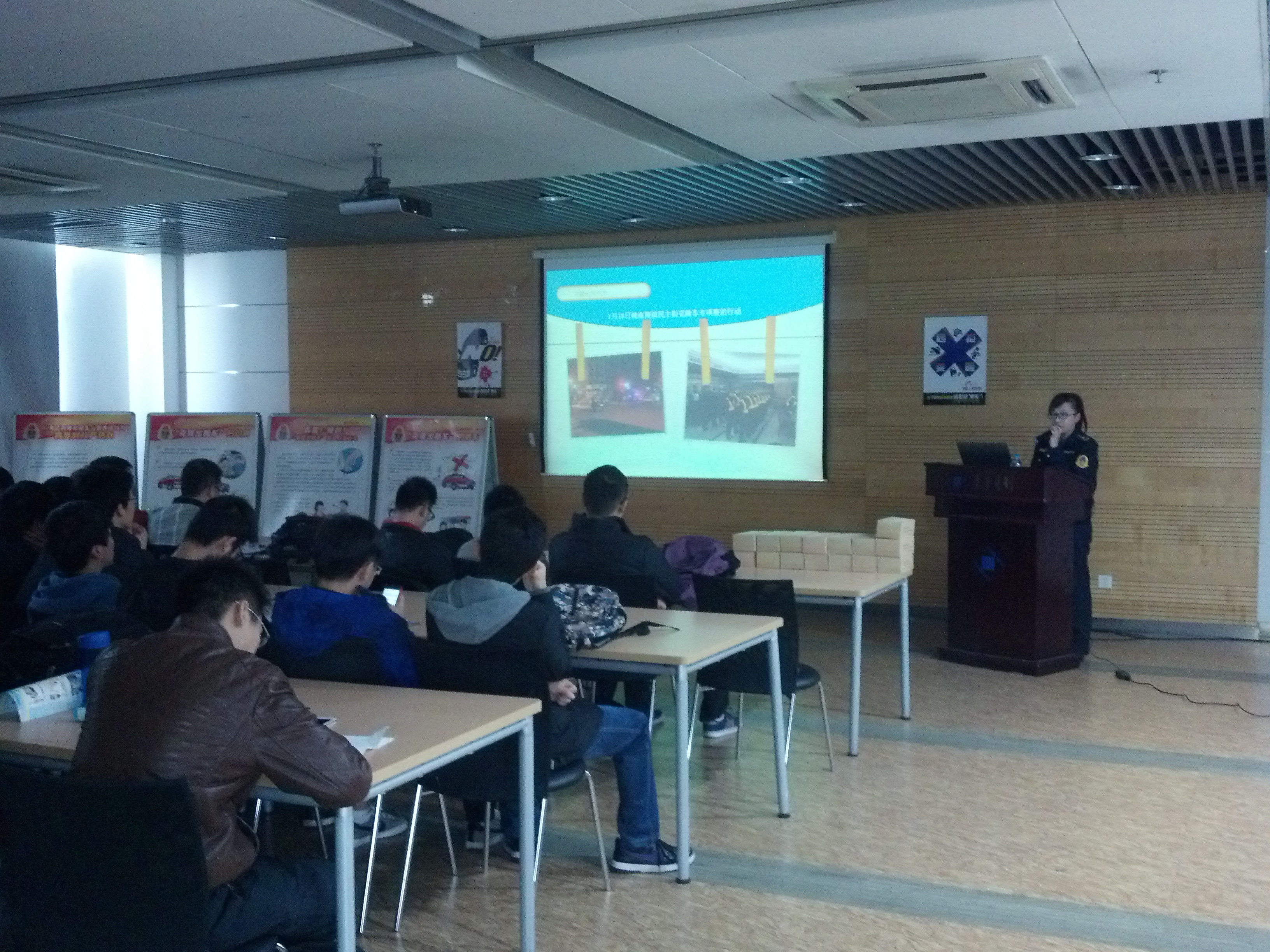 A311报告厅门口4块宣传牌尤其吸引人,同学纷纷驻足阅览,展板包括文明驾驶、选择出行方式、如何辨别黑车等内容。嘉定区交警大队的周老师先后在明智选择出行方式、交通安全知识、以及黑车克隆车五类车这几个方面为大家耐心的讲解,同学们在宣讲结束后踊跃提问,表达了自己对举报黑车的担忧,担心会有过多的程序需要配合交警,担心会受到黑车司机的威胁。交警队给予了耐心的解答,并告知不必担心。