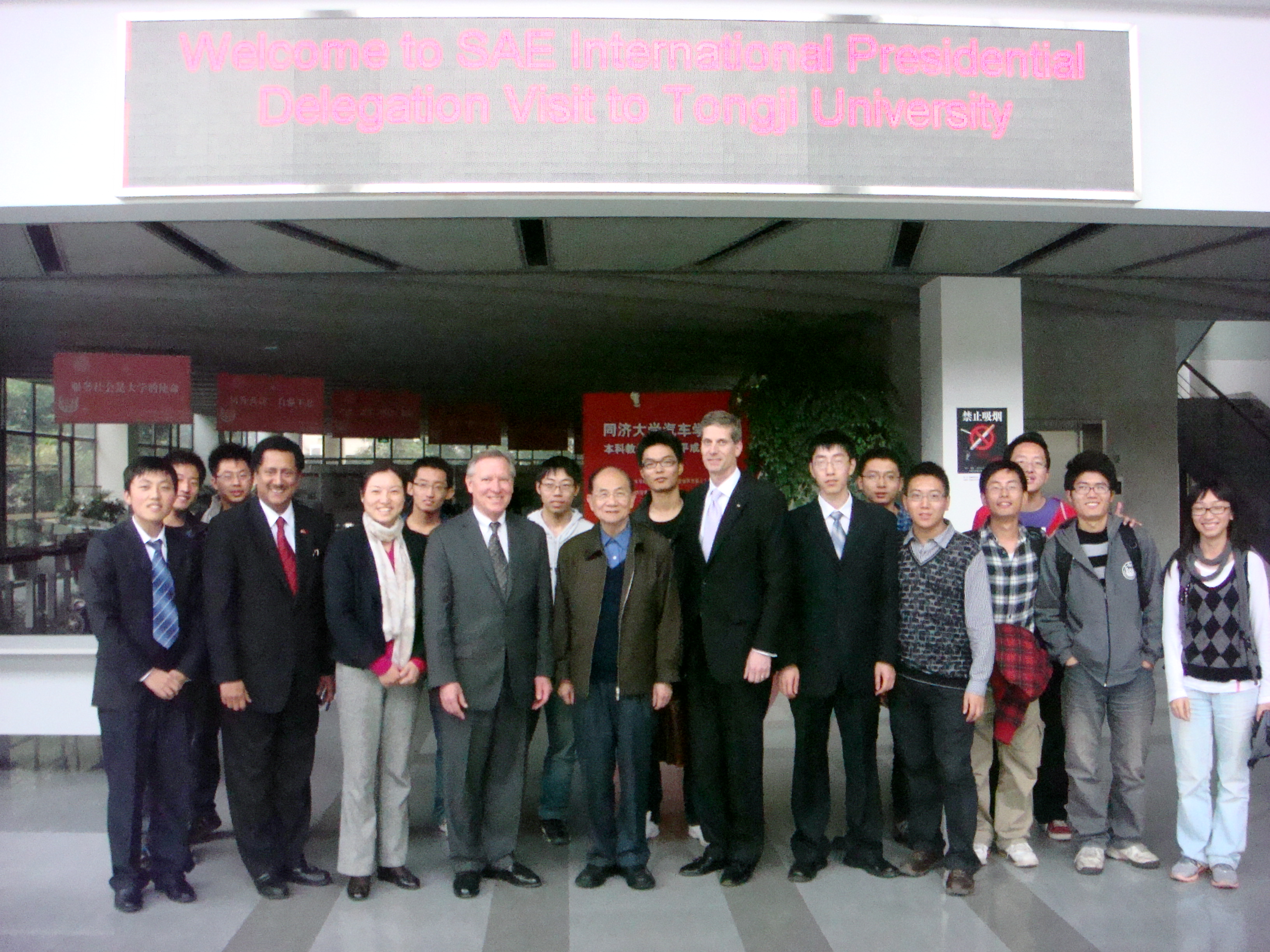 交流会的第一个环节是由来自SAE International的副主席Kleine博士向我们介绍柴油发动机的发展状况以及减少碳排放并提高燃油经济性的技术。之后,来自我校大学生方程式赛车(FSAE)车队的队长向Kleine博士以及主席团一行介绍我校FSAE车队的发展状况和今年的比赛成绩。Kleine博士高度评价了我们所取得的成绩并鼓励我们要继续发扬创新实践的精神。车队队长代表我校FSAE车队全体成员将精美的车队礼品赠送给了Kleine博士以及主席团一行。最后,所有出席的同学、老师和领导在楼下大厅与SAE International主席团进行了合影,并带领主席团一行参观偷拍视频